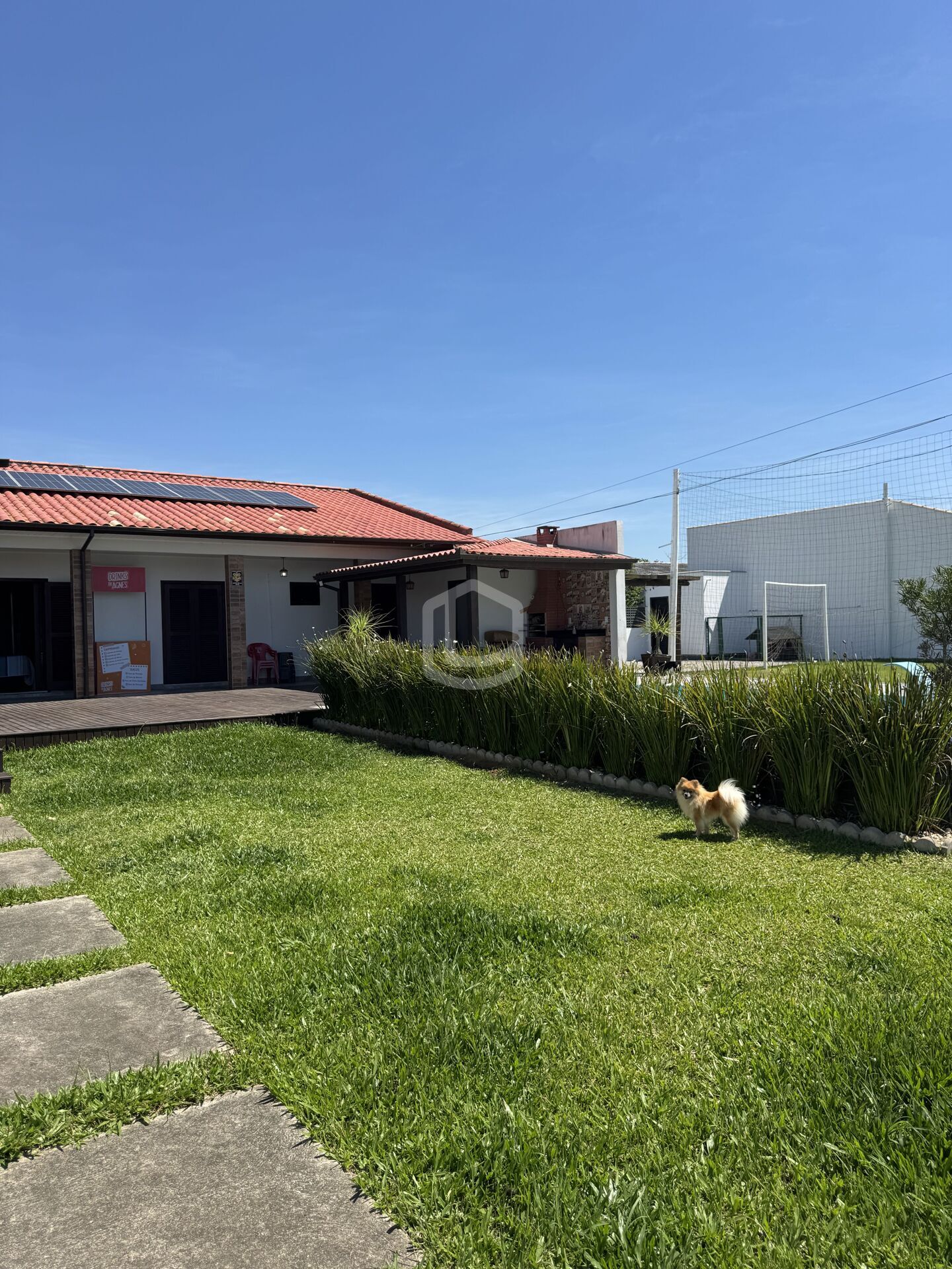 Área externa com deck, piscina, churrasqueira e campinho de futebol.